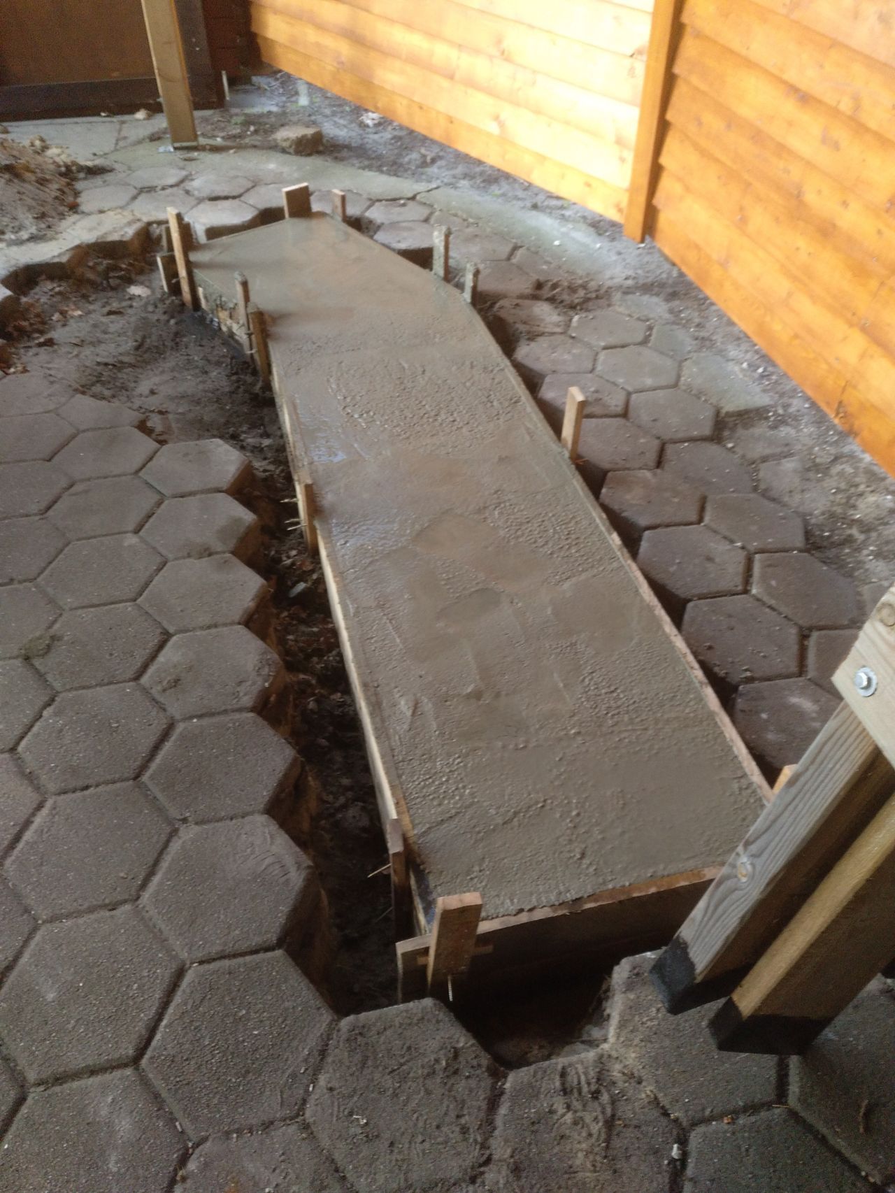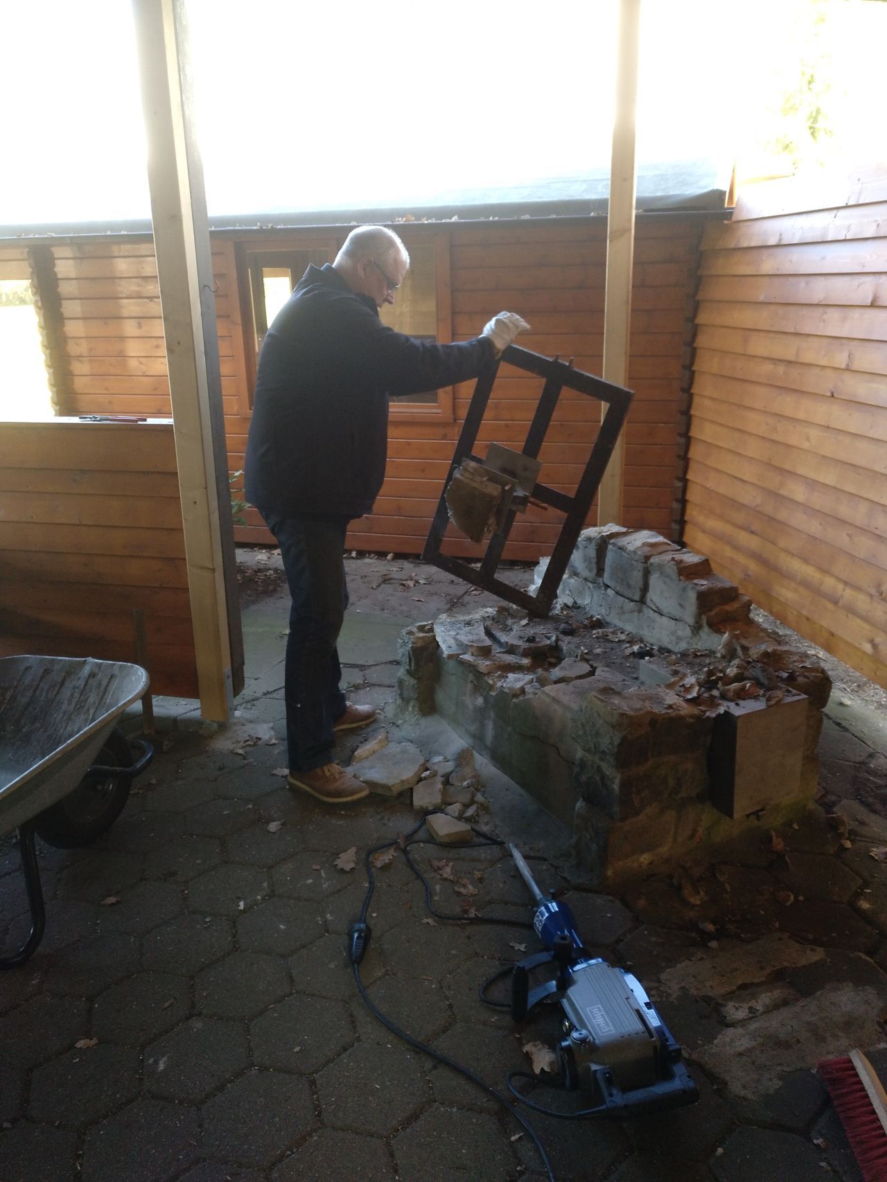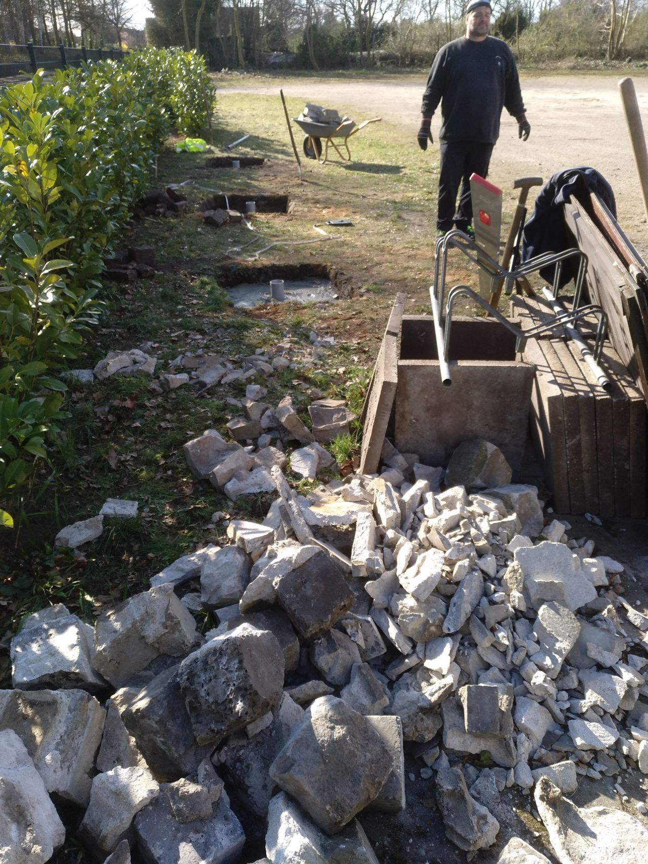 Drei Fahnenmaste an der Straßenfront sollen das Erscheinungsbild des Vereins bei Veranstaltungen hervorheben. Mit 1,7 m³ Beton sollte die Sturmsicherheit der 8 m hohen Masten hergestellt werden. Wir benötigten weniger Beton, galt es doch den Abbruch des alten Grills mit in die Masse einzuarbeiten.