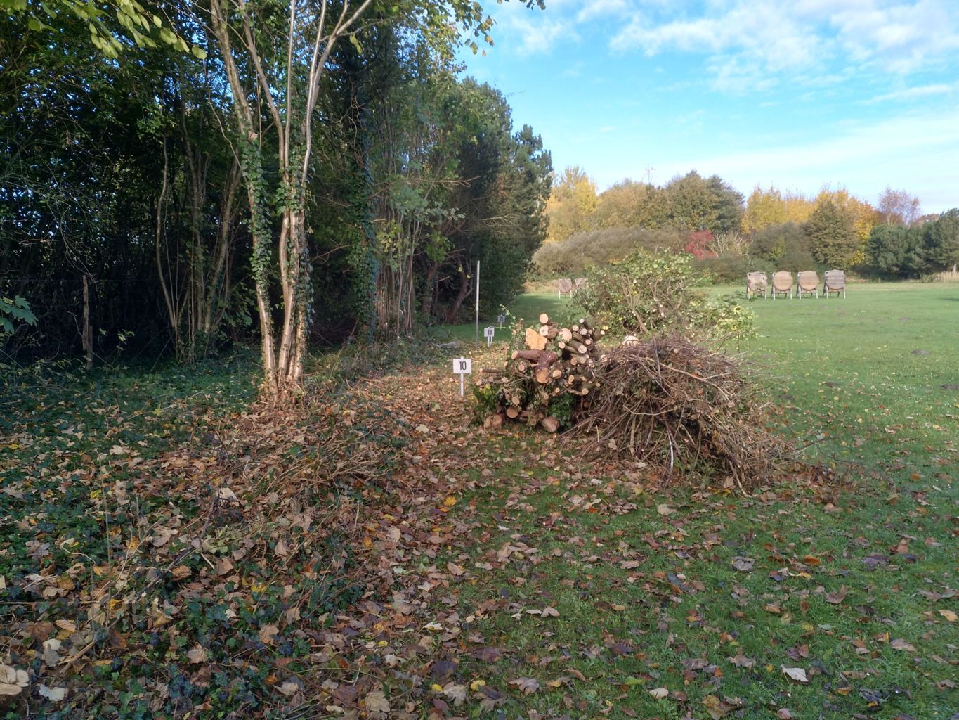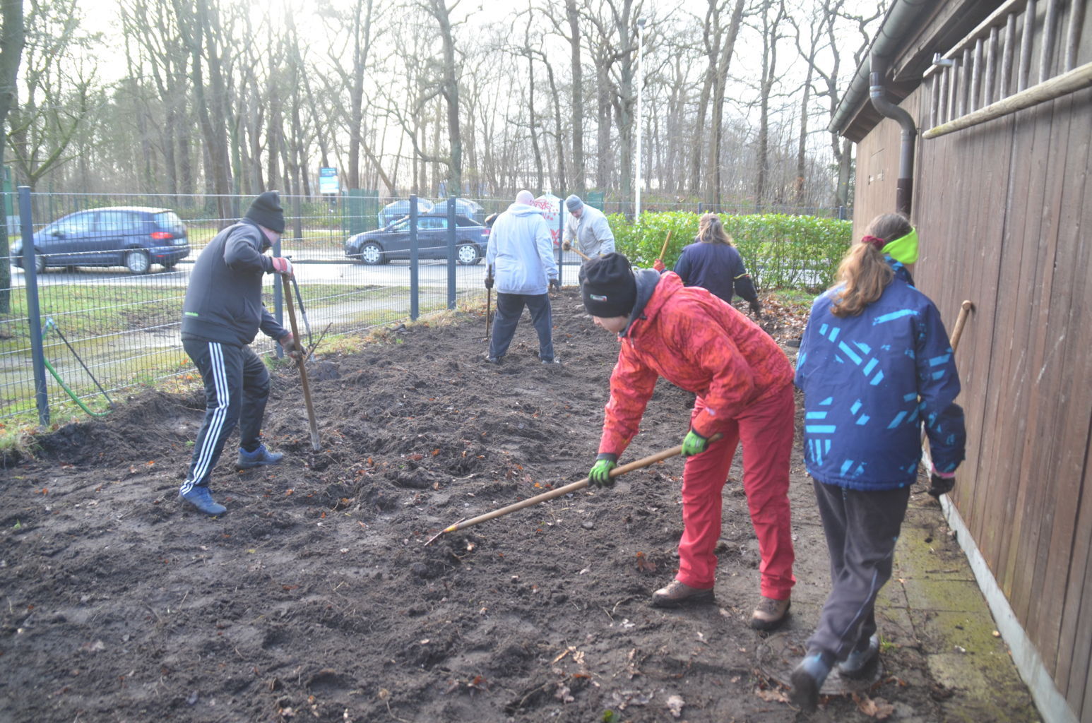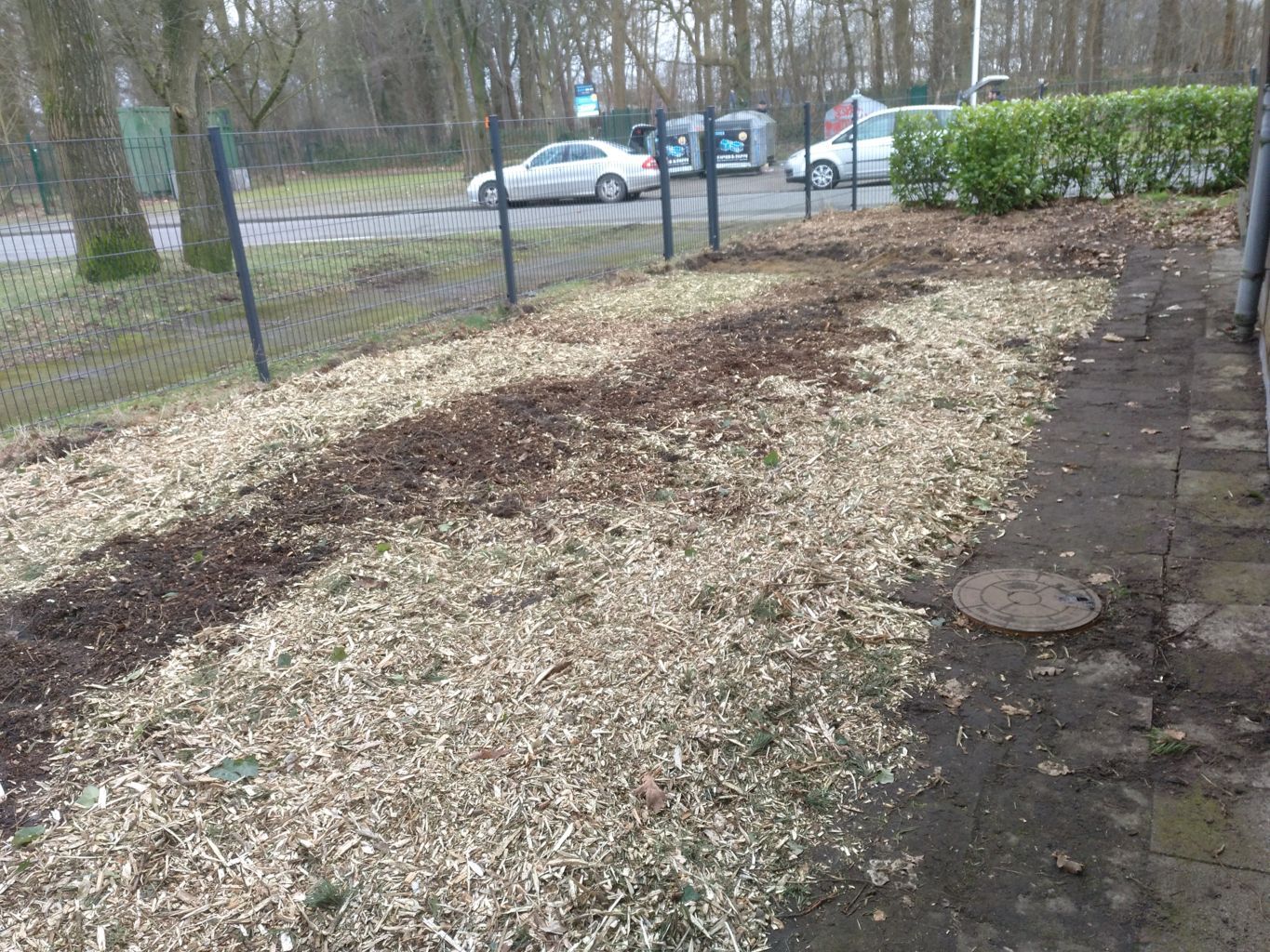 | Die Fläche neben der Hütte wurde geebnet und mit Mulch bedeckt, so dass sie so für eine weitere Bepflanzung im Frühjahr vorbereitet ist. |