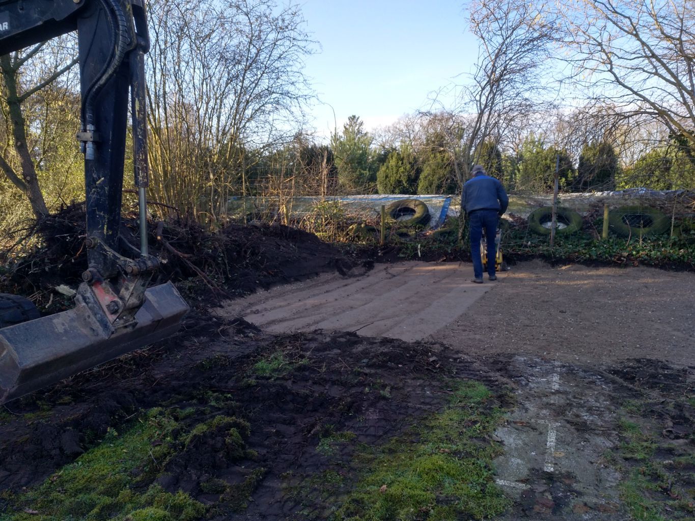Mit dem Beschneiden und Entfernen abgestorbener Bäume haben wir gleichzeitig eine Fläche links neben der Schießlinie gerodet, auf der ein Unterstand für eine neue Kampfrichter-Hütte geplant ist. Die Wurzeln in diesem Bereich haben wir durch ein Unternehmen mit einem Bagger entfernen lassen. Gleichzeitig wurde dort das Erdreich ausgekoffert und mit Schredder verfüllt als Basis für die neue Oberfläche mit Gehwegplatten.