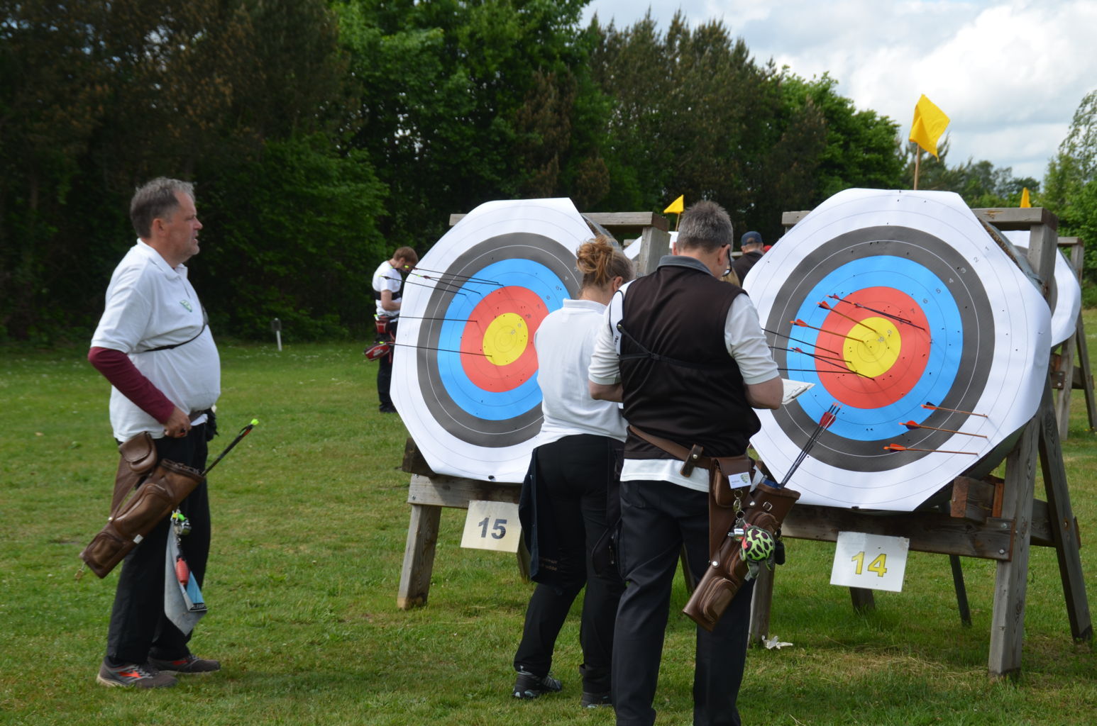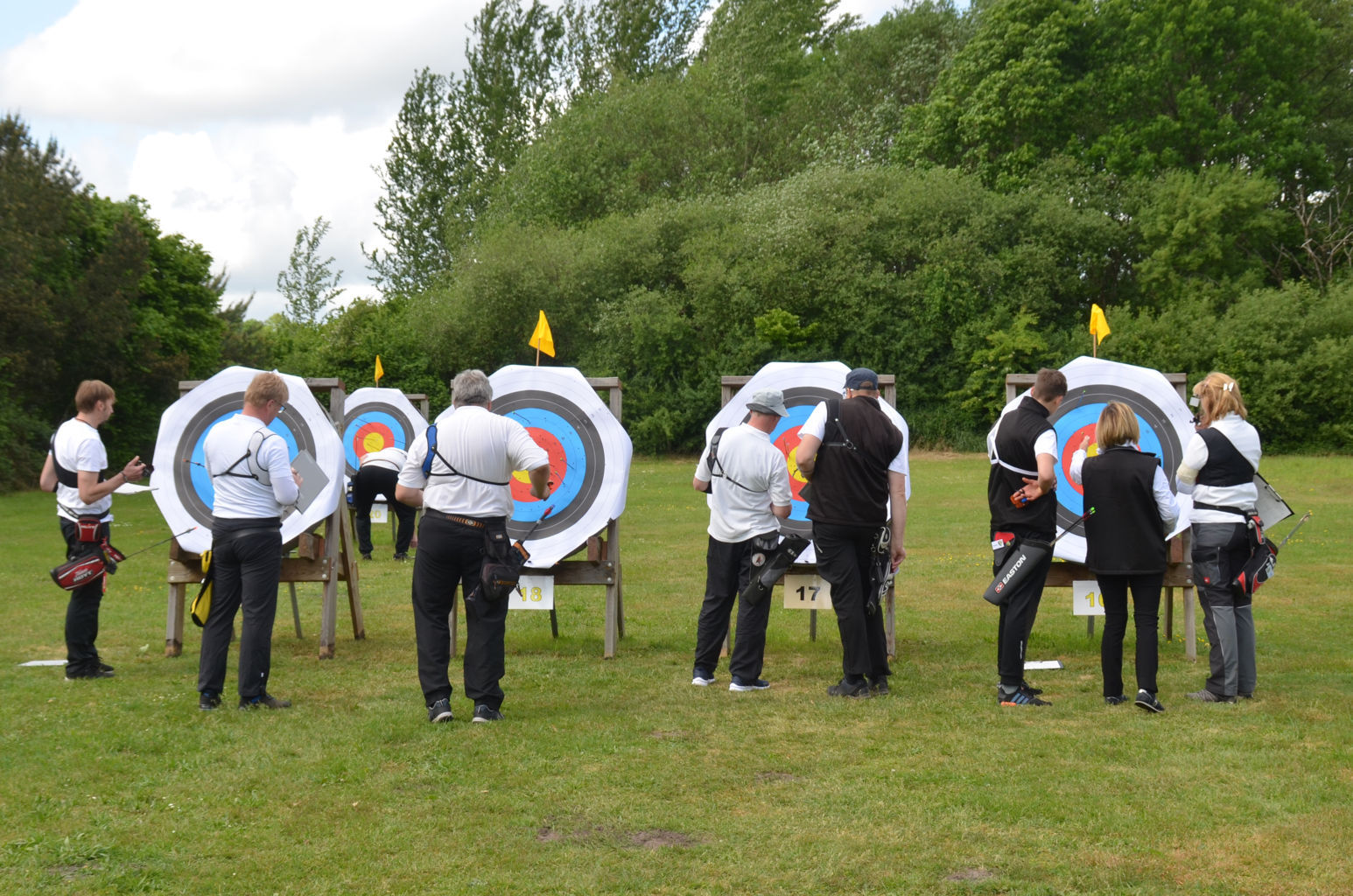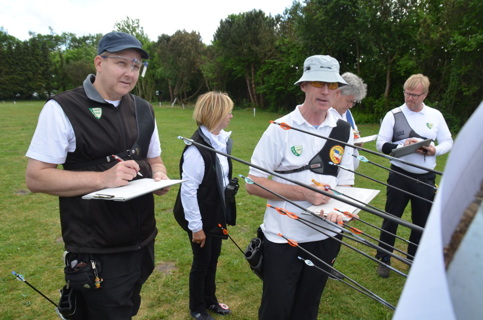 | Distanz 60 m: auf diese Distanz schießen Recurve-Schützen der Altersklassen Master (Birgit, Ronald, Viktor, Olaf, Volker und Josef) sowie Jugend (Vladi) |