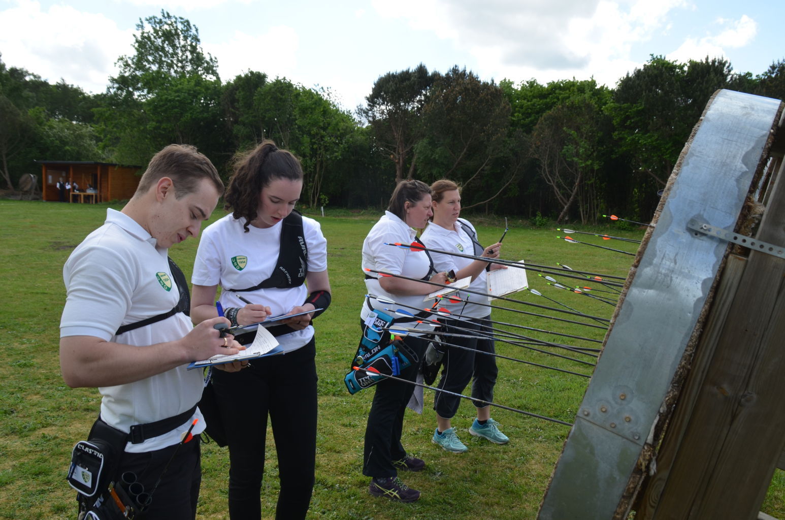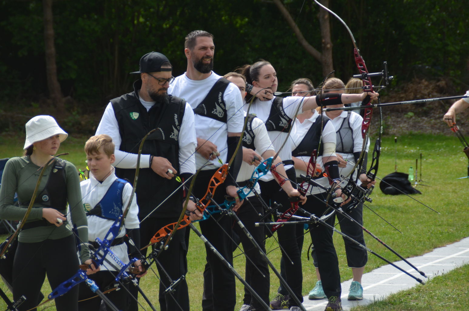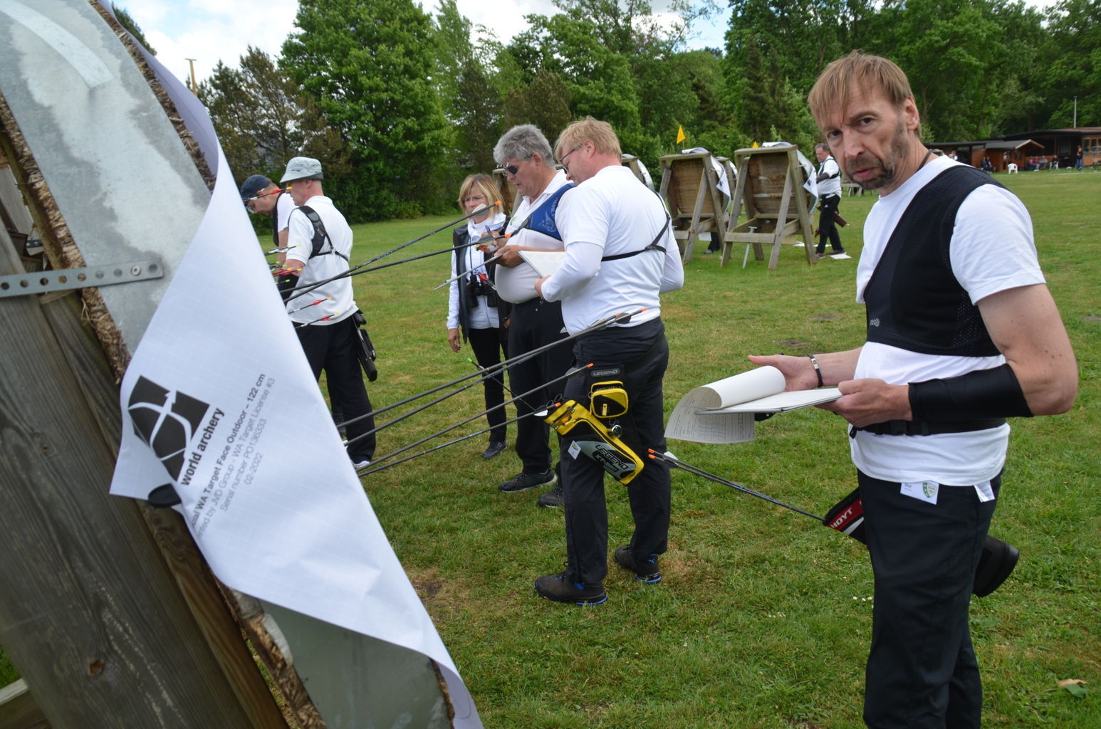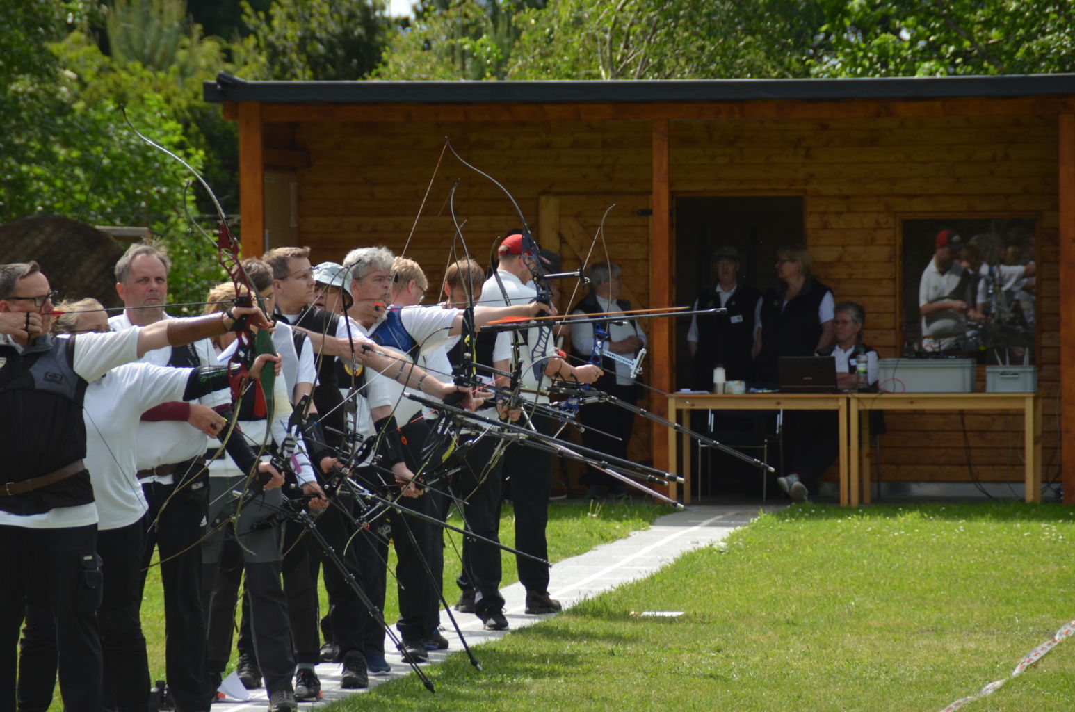 | Distanz 60 m: auf diese Distanz schießen Recurve-Schützen der Altersklassen Master (Birgit, Ronald, Viktor, Olaf, Volker und Josef) sowie Jugend (Vladi) |