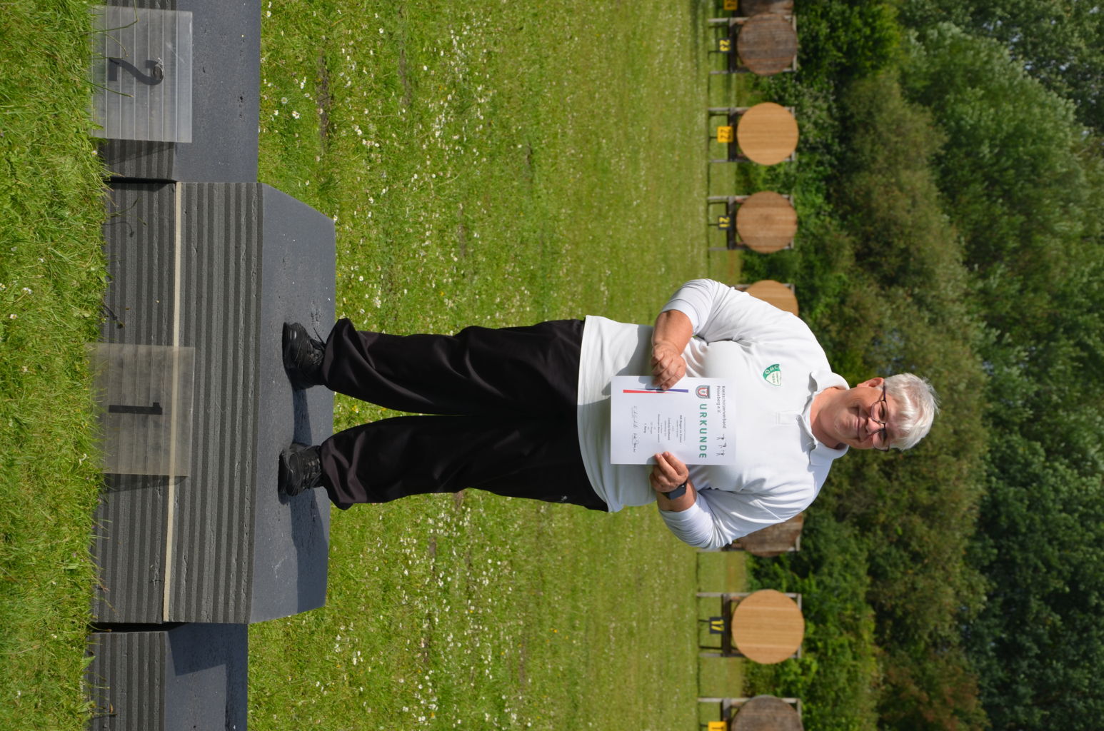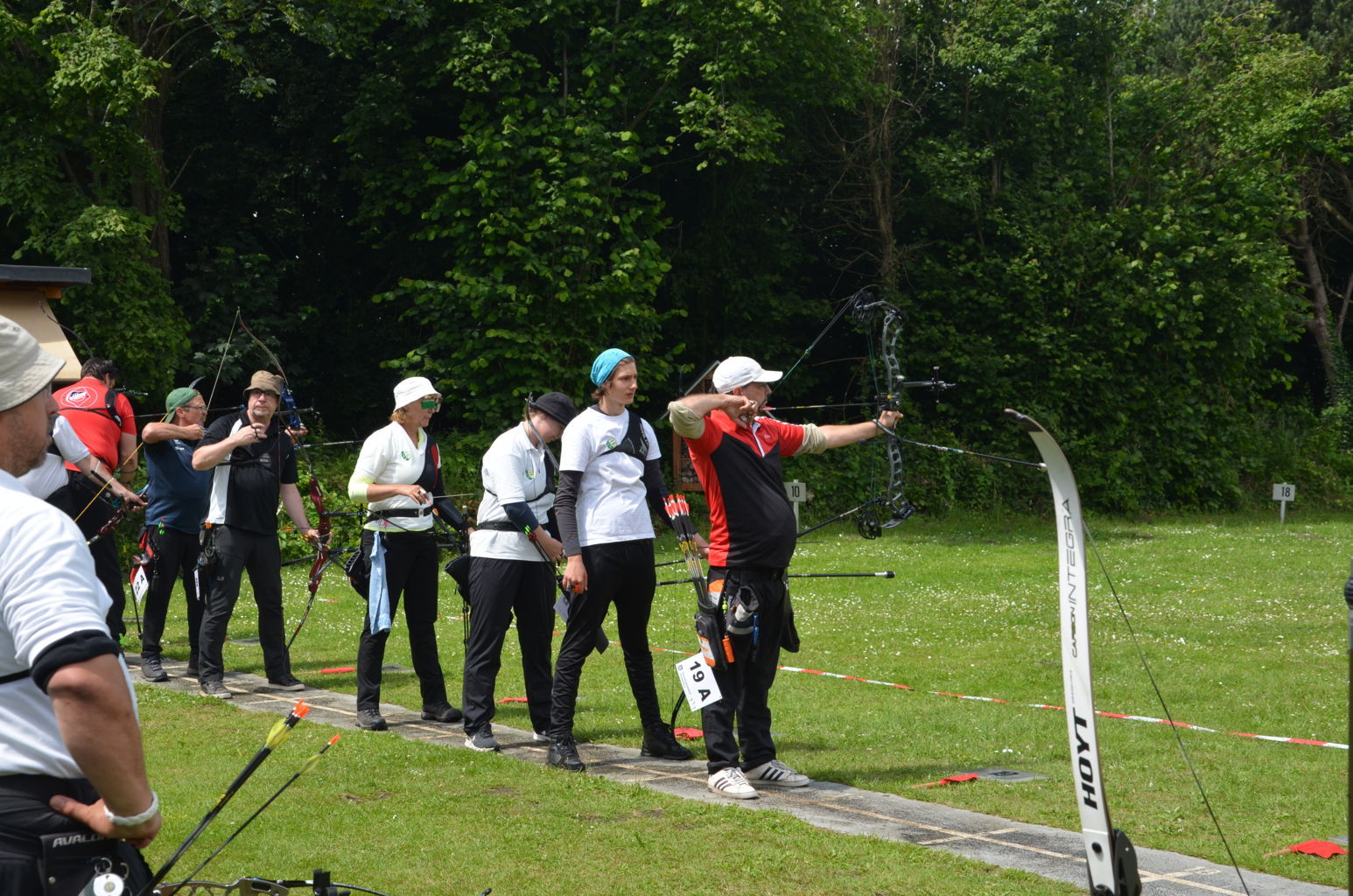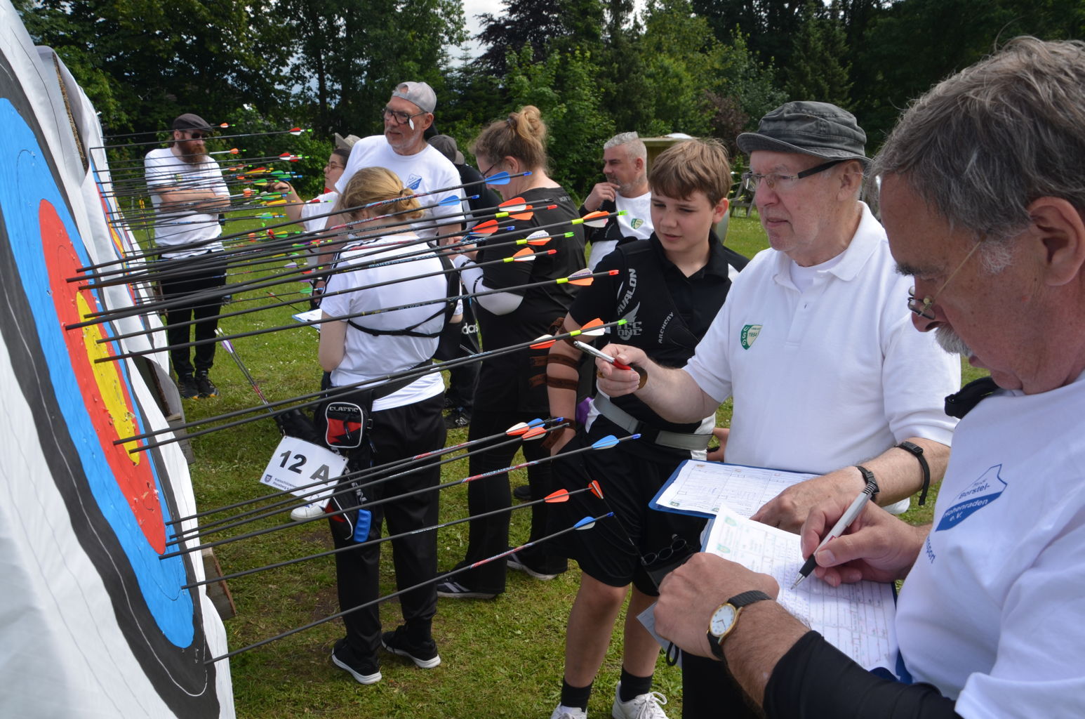 Am16. Juni 2024 wurde die Kreismeisterschaft Bogen im Freien durch unseren Verein ausgerichtet. 60 Schützen nahmen an dieser Meisterschaft teil, davon waren allein 1/3 aller Teilnehmer Schützen der USG. Dank einer Änderung der Bedingungen in der Ausschreibung nutzten bei dieser KM auch erstmals 13 Schützen aus vier Vereinen die Möglichkeit, in neuen Kreisklassen auf 30 m oder 50 m mitzuschießen. Mit dieser Regelung wird neuen wie auch älteren Schützen eine Teilnahme an der KM ermöglicht, die noch nicht oder nicht mehr die größeren Distanzen schießen können, die in ihrer Alters- und Bogenklasse erforderlich wären. Diese neuen Kreisklassen lassen allerdings keine Teilnahme an der folgenden Landesmeisterschaft zu. Das Wetter war sonnig und bewölkt, Regen und sogar Gewitter für den Nachmittag waren angesagt. Doch außer einem kurzen Schauer konnte das Turnier problemlos durchgeschossen werden. Nur ein einzelnes Grollen deutete auf eine Gewitter hin, dass in weiterer Ferne vorbeizog.Ein paar Bilder geben einen Eindruck von diesem Tag auf unserem Bogengelände. |